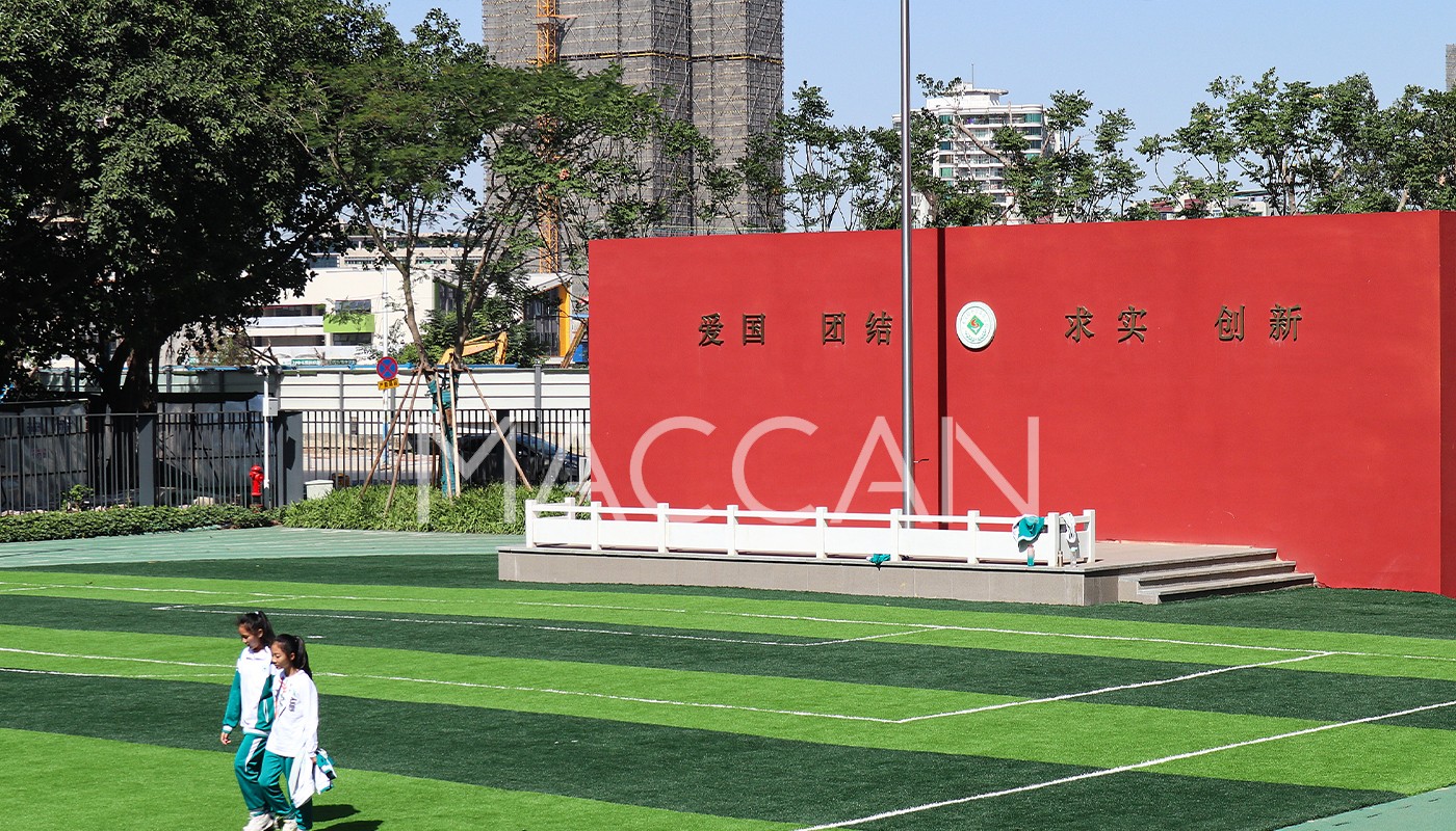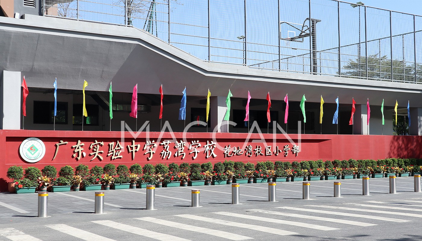 省實荔灣學(xué)校(花地灣校區(qū))位于廣州市荔灣區(qū)花地大道北320號。花地灣校區(qū)總用地面積約2.58萬平方米,總建筑面積約5.14萬平方米,總投資約2.73億元。穿越建筑體之間,鮮明的圖案與字體是學(xué)府身份的象征,標識此刻略顯鋒芒。